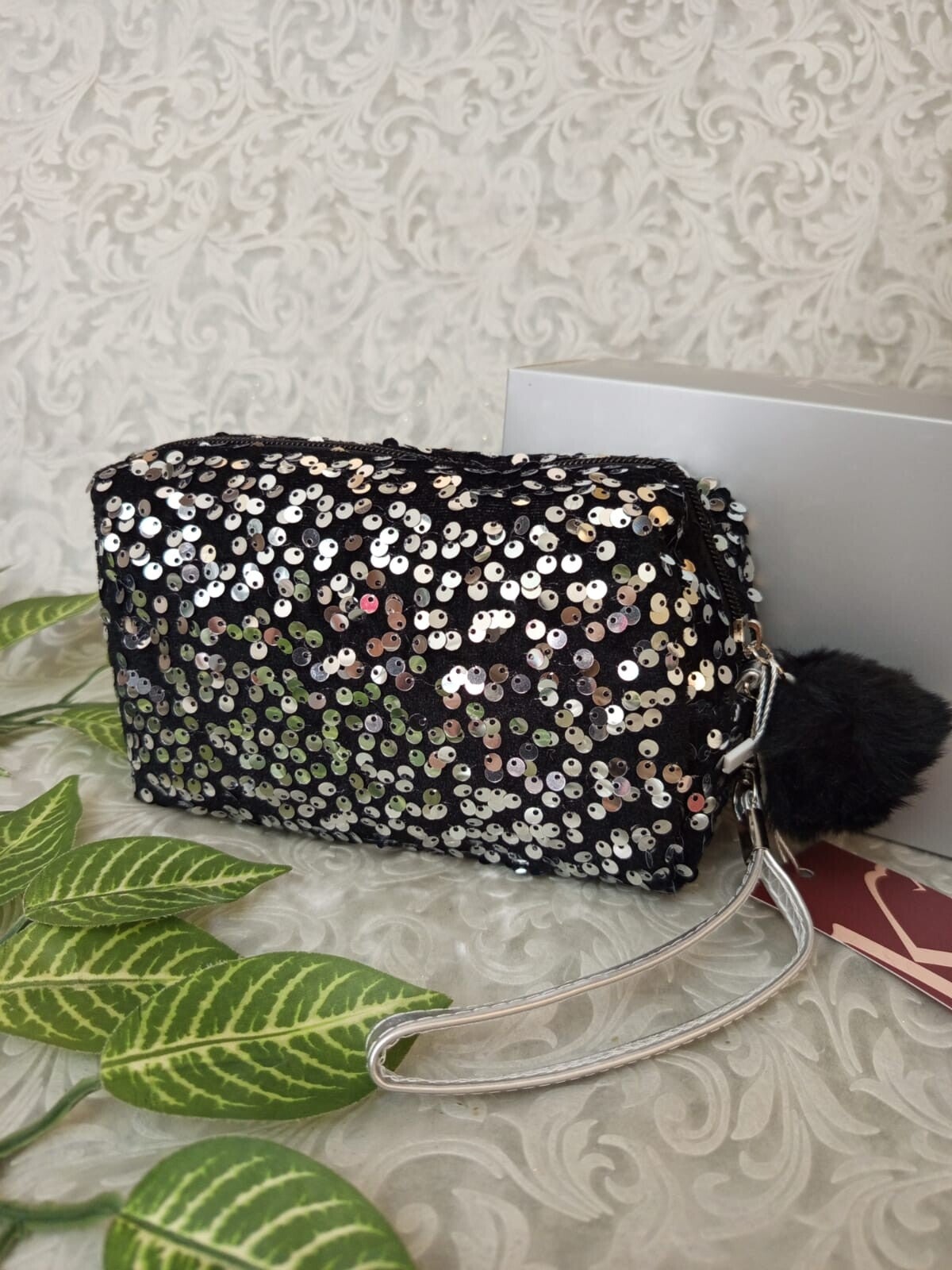 Pochette nera con pailettes argento, cerniera con ciondolo e pon pon, elegante e raffinata, ideale sia per uscire che come beauty.