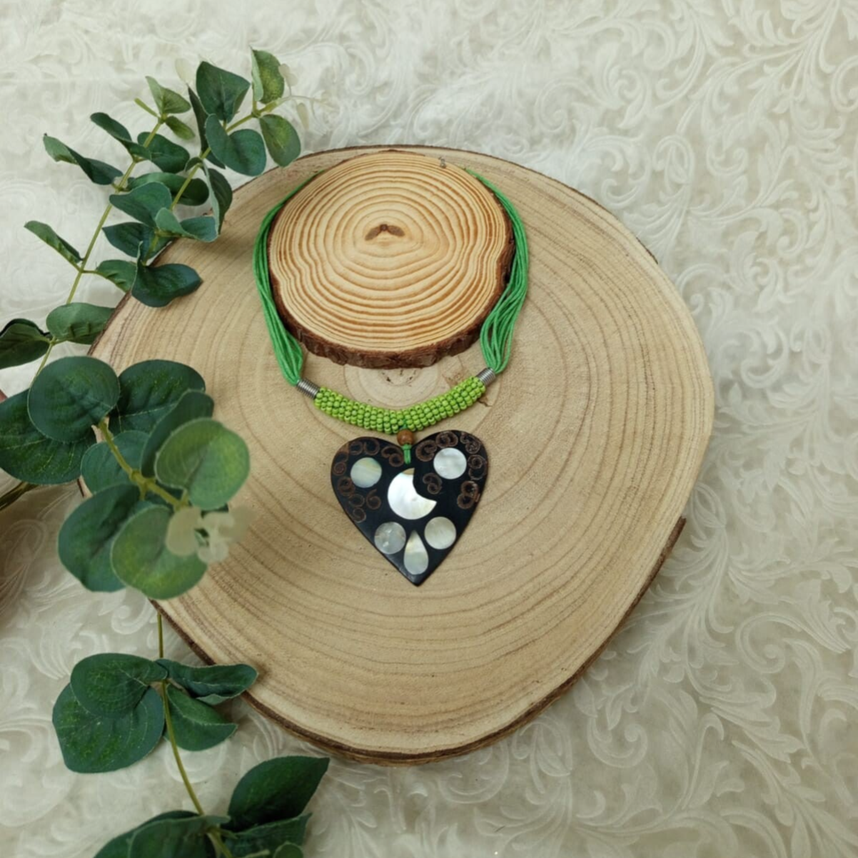 Collana Green, formata da fili di spago colorato che sfociano in un particolare medaglione a forma di cuore, per un look eccentrico, estivo e fresco.
